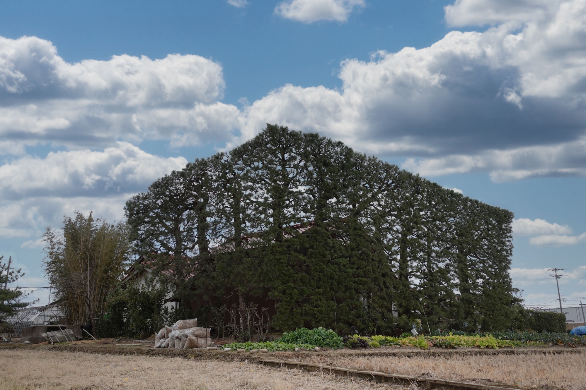 陰手刈り後、幾何学的な造形美を取り戻した築地松。すっきりと透かれた枝葉はまるでレースのカーテンのようです。雄々しさと繊細さ。築地松独特の存在感と美しさは、陰手刈りによって生み出されるのです。