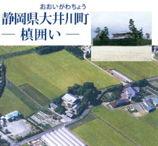 富士山を眺望できる大井川町は、静岡県のほぼ中央を流れる大井川の左岸河口部に位置する、山ひとつない平坦な町です。この大井川は、江戸時代に街道一の交通の難所であっただけでなく、梅林や台風シーズンには頻繁に氾濫や破堤を繰り返してきた歴史を持っています。そこで、先人が水害から家屋敷を守るために考え出したのが「舟形屋敷」なのです。屋敷の周りを上流方向に向けて舟の舳先のような形に土手で囲い、先端部にはより水防の効果を増す「ボタ(土盛りした上に竹や樹木を植えたところ)」を築いています。また、三角形や長方形に屋敷どりをし、その三辺や二辺、あるいは全周を土手で囲った変形の「舟形屋敷」もあります。